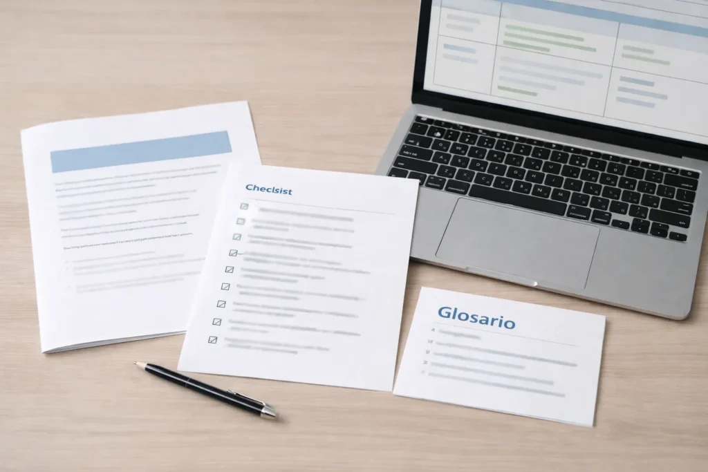 Cada recurso puede incluir PDF explicativo, plantillas rellenables, checklist de revisión y glosario (según producto). En cada ficha se especifica el contenido exacto.